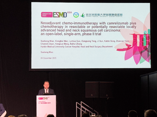 “卡瑞利珠单抗联合化疗新辅助治疗可切除或潜在可切除的局部晚期头颈部鳞癌研究”入选了本次大会的简短口头报告。12月6日,哈尔滨医科大学附属肿瘤医院的苗素生教授在大会现场进行了报告。研究结果显示[3],客观缓解率(ORR)为61.9%,疾病控制率(DCR)为95.2%。所有患者均成功接受手术,R0切除为100%,下咽癌患者保喉率为77.8%。从末次用药至手术的中位间隔时间为27天,中位手术时长为292.5分钟,中位术后住院时间为11天。13例患者(61.9%)实现了临床降级。术后病理分析显示,5例患者(23.8%)达到病理完全缓解(pCR),4例(19.0%)在靶病灶中实现pCR。卡瑞利珠单抗联合化疗作为局部晚期HNSCC的新辅助治疗方案显示出潜在的疗效和可控的安全性。